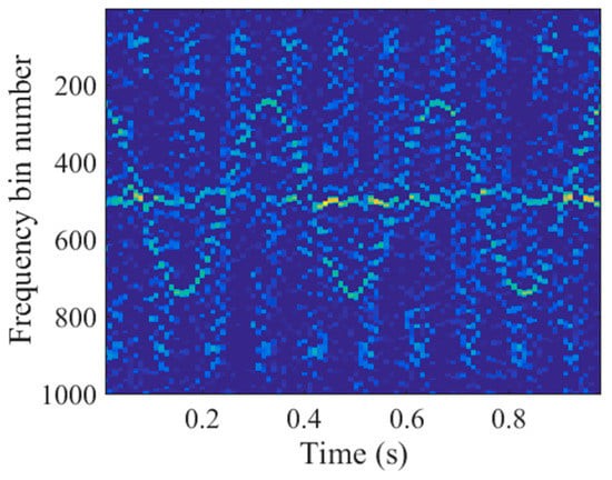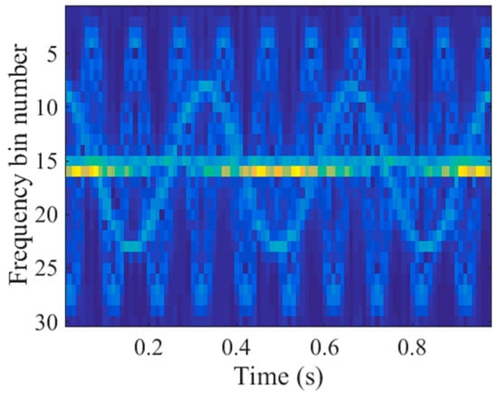 To obtain the time-frequency representations, we applied the STFT to the echoes in the 40th range cell of the spectrogram. The time step was 10 PRI and the window width was 30 PRI. Thus, there were 30 frequency bins in the time-frequency domain. As shown in Figure 4, the main body signal was located at the 15th and 16th frequency bins. Consequently, the support of the main body signal in the time-frequency domain was slow time invariant which indicated the joint sparsity of the main body signal. In contrast, the micromotion scatterers’ Doppler frequencies were slow time variant and the micromotion signal had the shape of sinusoids, as illustrated in Figure 4. Because of the distinct patterns, the micromotion signal could be removed by promoting the joint sparsity in the time-frequency domain, which is detailed in the next section.