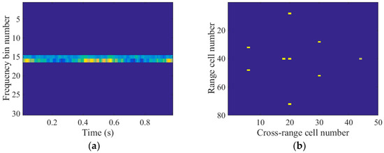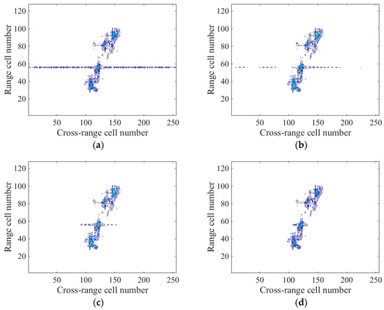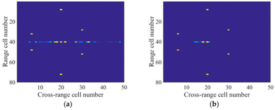 where is the cross-range compression result of , and is a partial Fourier matrix with its element given by . is the Doppler frequency bin, and is the sampling point of the slow time. Subsequently, we used the sparse Bayesian learning (SBL) [25] algorithm to achieve the cross-range compression of by recovering in Equation (35).