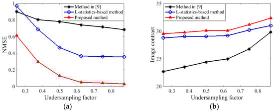 Performance of different methods: (a) Normalized mean square error (NMSE) against undersampling factor; (b) Image contrast (IC) against undersampling factor.