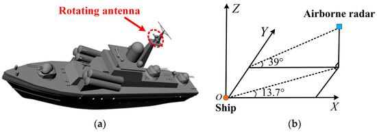 To further testify the performance of the proposed method, we used the echoes of a ship target generated by the graphic electromagnetic computing (GRECO) technique [32], which combines physical optical (PO) theory and physical theory of diffraction (PTD). The target model is described in Figure 9a, where the dashed circle indicates the antenna rotating with a frequency of 1 Hz. Figure 9b depicts the imaging geometry. The ship was 6.9 km from the airborne radar and located at the origin. The radar operated at 5 GHz, the bandwidth was 1 GHz, and the radar moved along the opposite direction of the -axis with a constant velocity of 300 m/s. 256 pulses were collected in a CPI of 2.3 s and the SNR was 20 dB. We obtained the limited measurements by choosing 128 pulses randomly. Within each pulse, there were 128 complex range samples. The window width and the time step of the STFT were 20 PRI and 2 PRI, respectively. According to the aforementioned parameters, the size of was calculated to be .