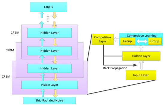 The framework of the CDBN is shown in Figure 1. The training procedure is described as follows. Firstly, an RBM is pretrained with a large amount of unlabeled data and a small number of labeled data in an unsupervised learning way, which provides initialized parameters for further optimization. Secondly, for the hidden layer, this architecture groups its hidden units based on their scores corresponding to different categories. Thirdly, a competitive layer with a mechanism of intragroup enhancement and intergroup inhibition is constructed by adding a lateral connection among the grouped hidden units. A gradient algorithm is applied to update parameters of RBM to build the competitive restricted Boltzmann machine (CRBM). Finally, the CDBN is constructed by fitting a stack of the designed CRBM, and the whole model is then discriminatively fine-tuned to maximize its probability of predicting the underwater acoustic targets.