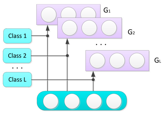 The category that makes the score of a given hidden unit have a maximum value will be regarded as the corresponding category of that hidden unit. The hidden units that have the maximum score will be included in the kth group. The frame of the hidden-unit grouping method is shown in Figure 2. In general, each hidden unit belongs to only one group, and each group contains at least one hidden unit. Otherwise, the RBM is probably in a state of under-fitting. By applying this grouping method, the model makes the preliminary selection of hidden units and plays a role of initialization for the subsequent competitive learning.
