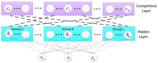 where and represent the jth neurons of the competition layer and the hidden layer, respectively, and is the learning rate. The training stops once the neurons stabilize, with each neuron in the competitive layer at the center of a cluster, and each group of such neurons mapped to a certain category. The proposed CRBM can also fulfil the task of clustering, while keeping the RBM structure unchanged.