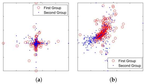 The t-SNE [20] feature-visualization method was used to observe the distribution of weight vectors in RBM and CRBM. The goal was to test whether the competitive learning can improve discriminative performance. 500 hidden units of trained RBM were divided into two groups according to categories. The scatter diagram of the grouped weight vectors of RBM viewed by t-SNE is shown in Figure 5a. A similar result of first-layer CRBM in CDBN is shown in Figure 5b, which is seen to be more distributed than that in Figure 5a. The results indicate that the proposed CRBM can learn the differences of ship types.