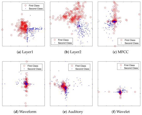 2-dimensional feature map viewed by t-SNE on the training samples. (a) 50 features of Layer1; (b) 50 features of Layer2; (c) 36 features of MFCC, DMFCC and DDMFCC; (d) 8 waveform features; (e) 24 auditory features; (f) 14 wavelet features.