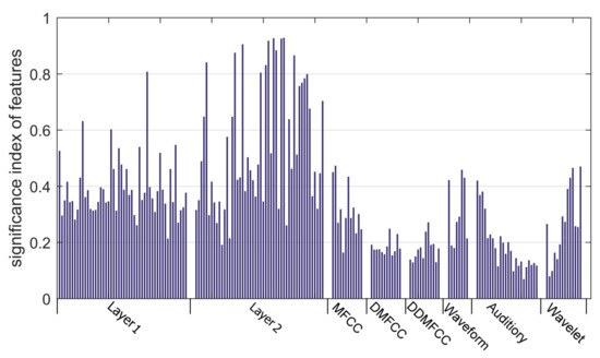 In addition, the combination of all traditional features and the combination of all hidden layers are compared. In consideration of the difference of dimension, a feature-selection algorithm was applied to the two feature sets to make a fair comparison. According to the significant index of each feature shown in Figure 8, features were sorted in descending order, and then they were selected incrementally to make up the input feature subsets of the SVM classifier.