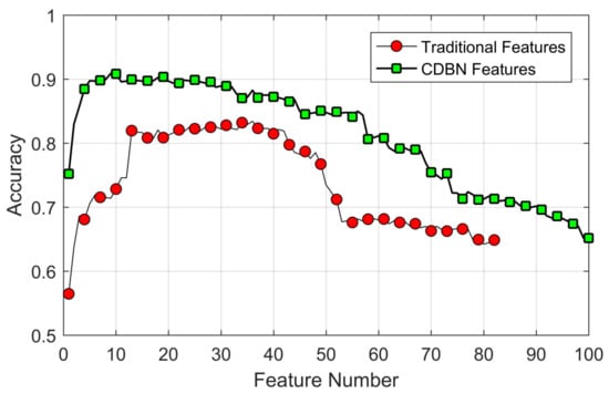 Results are shown in Figure 8. By applying the feature-selection algorithm on traditional features, the SVM classifier could achieve an accuracy of 83.42% with 36 features, while the highest accuracy obtained on CDBN features is 90.89% with nine features. The proposed method can achieve an 8.95% improvement of the classification accuracy on fewer features.