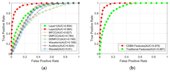 Assuming that the first class was positive and the second class was negative, receivers operating characteristic (ROC) curves were constructed from decision function scores of SVM classifiers obtained on test data. Figure 9 shows the comparison of ROC curves of SVM trained on CDBN features and the previous state-of-the-art features. ROC curves obtained from features in Layer1 and Layer2 together with each traditional feature set are shown in Figure 9a. In addition, ROC curves obtained from the best nine CDBN features and the best 36 traditional features are shown in Figure 9b. Normalized area-under-ROC curve (AUC) is calculated. As shown in Figure 9a, SVM trained on features in Layer2 has the highest AUC. The performance of Layer1 is the second best. In Figure 9b, the AUC obtained from CDBN features is higher than that obtained from traditional features. In particular, the SVM trained on CDBN features exhibits 100% true-positive rate at 27.5% false-positive rate, which is lower than that trained on traditional features, and this property is desired in ship-radiated noise recognition tasks.