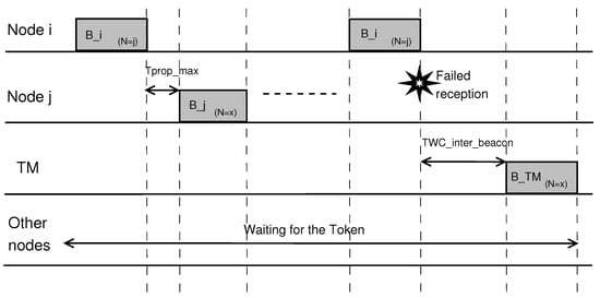 After receiving a message with the piggybacked token, the platoon member that is selected as the next token holder must wait for a specific period of time (depending on the role of the vehicle in the token passing process and the event-driven transmission method, as explained below) before it can begin its transmission. This waiting period, , is a function of the propagation time, , from the first to the last vehicle in the platoon, ensuring that all vehicles had a chance to receive the last transmission before the new token holder takes action. Figure 1 shows an example of our token passing method where node i broadcasts its beacon and selects node j as the next transmitter. If node j receives the beacon from node i, it waits for and broadcasts its beacon. Otherwise, the token is lost, and the token manager (TM) must re-generate a new token.