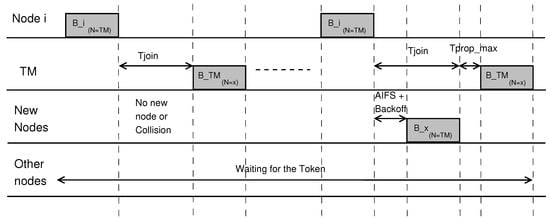 Equation (1) in Section 3.1 showed the maximum beacon inter-arrival time, without accounting for any joining period, lost token, or a phase for event-driven messages. A join period is an extra period during which joining is allowed, and it takes place after the manager gets the token (see Equation (2)). Therefore, for N vehicles, the worst-case beacon round-trip time when no packets are lost is: