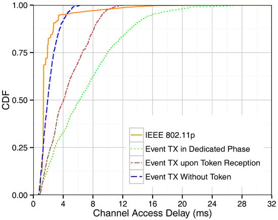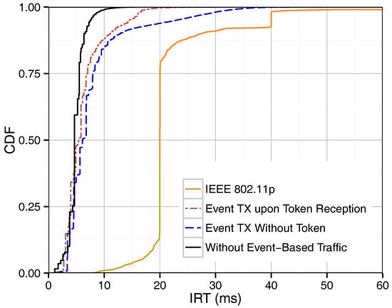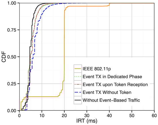 As mentioned above, we proposed three different methods for supporting event-driven messages. Figure 3 shows the IRT of beacons in our token-based MAC protocol with and without the presence of event-driven traffic in the network, and it provides a performance comparison with IEEE 802.11p. In the case of IEEE 802.11p, beacons and event-driven traffic attempt to access the channel only once per assigned period. The IRT of IEEE 802.11p beacons monitored in Figure 3 lies therefore mostly around the 20 ms mark, which is the beacon period defined. Delayed channel access due to contention leads to beacon IRTs that are longer or shorter than exactly one period, as shown in the graph for IEEE 802.11p. The proposed token passing scheme, on the other hand, retransmits beacons within one period as long as there are resources available. Therefore, considerably shorter IRT values are achieved. As expected, the case where no event-driven traffic is present in the network is associated to the lowest IRT values. The introduction of event-based traffic, regardless of the method chosen, utilizes bandwidth for event-based packets instead of beacon retransmissions, and therefore shows a slight increase of IRTs. If event-driven messages are sent during a dedicated phase or upon token reception, they simply occupy the bandwidth that would otherwise be used for beacon retransmissions, and thus they have only a small influence on the IRT. On the contrary, the third method, where event-based messages can be sent without waiting for the token, actually interferes with the token passing order, resulting in decreased beacon performance. Using Equation (4), the maximum round-trip time without considering token losses is equal to 9.4 ms. As shown in the figure, the maximum IRT value is in general about 10 ms, being higher values related to token losses.