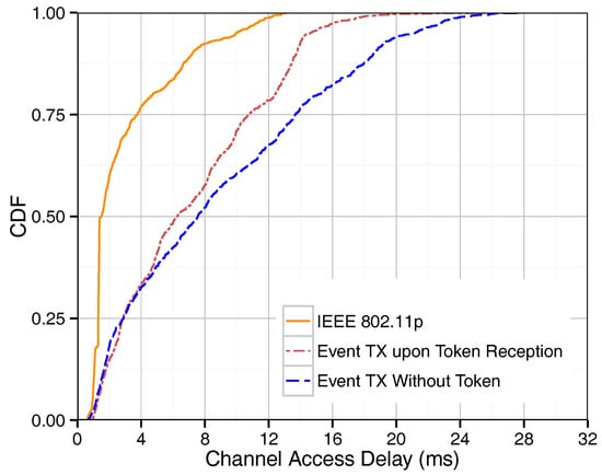 Figure 6 shows the channel access delay for IEEE 802.11p and our protocols. As expected, IEEE 802.11p achieves better performance compared to our methods in terms of delay since 802.11p allows immediate access to the channel as soon as it is idle. Instead, for the “event tx upon token reception” method, a vehicle carrying an event-driven message to send must wait for the token before transmitting or relaying. However, the maximum delay achieved by our protocol never exceeds 20 ms, thereby meeting the required delay bound for safety applications [27]. In contrast to single-hop broadcasting, the “event tx without token” method shows a longer channel access delay than the “event tx upon token reception” method due to the high traffic load by forwarding messages. In the “event tx without token” method, after any event-driven message reception, all platoon members attempt to forward such message using CSMA much like with IEEE 802.11p. Therefore, the probability of collision is increased, which also leads to increased channel access time.