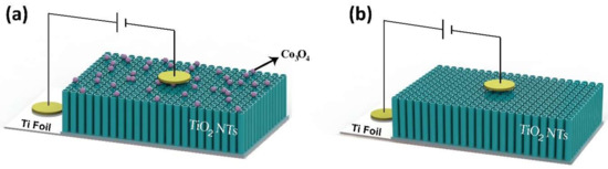 Measurement scheme of (a) pristine TiO2 nanotubes (NTs) and (b) Co3O4/TiO2 heterostructures.