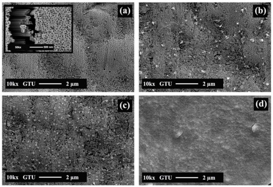 SEM images of (a) pristine TiO2 NTs, (b) CT-1, (c) CT-2, and (d) CT-3.