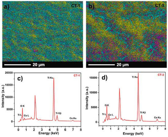 EDS mapping results of (a) CT-1 and (b) CT-3 sample, and EDS spectrum of (c) CT-1 and (d) CT-3 samples. In the mapping results, yellow represents O, blue represents Ti, and purple represents Co.