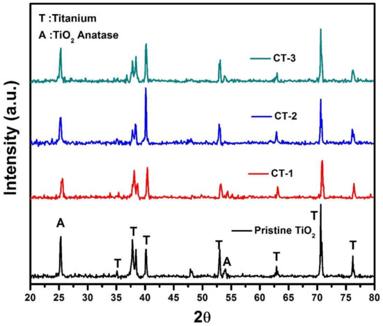 XRD patterns of pristine TiO2, CT-1, CT-2, and CT-3 samples.