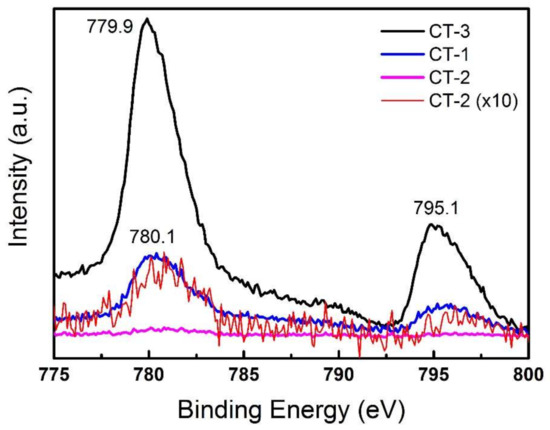 Figure 5 shows Co 2p spectra of CT-1, CT-2 and CT-3. CT-1 and CT-2 spectra show two peaks at binding energies of 780.1 eV and 795.1 eV, corresponding to Co 2p3/2 and Co 2p1/2 peaks, implying a Co3O4 form [25]. The peak intensity of CT-2 is lower than CT-1 (the intensity of CT-2 is magnified 10× for clarity in Figure 4), indicating lower coverage compared to CT-1. The Co peak intensity of CT-3 is the highest, which was expected from the complete Co3O4 layer. The Co 2p3/2 peak of CT-3 shifted to 779.9 eV, which can be attributed to the increase in Co3O4 coverage from the sub-monolayer to the multilayer, resulting in a change in the local electronic properties and bonding geometries. Similar shifts have been observed in TiO2 and Al2O3 films as well [26,27,28].