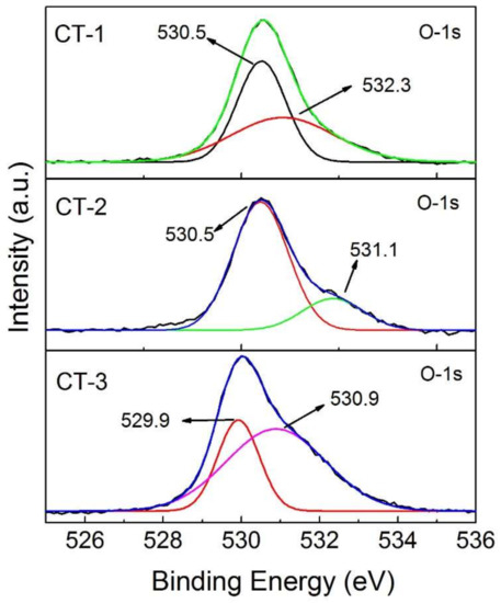 XPS spectra of the O 1s regions of CT-1, CT-2, and CT-3.