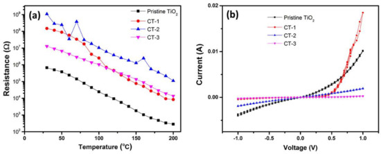 Current–voltage (I–V) measurements were performed in the temperature range of 20–200 °C to investigate the electrical properties of fabricated samples. Au electrodes 100 nm thick were thermally evaporated on top of the fabricated samples as shown in Figure 1a,b. Because of the geometry of the devices, measurements were performed for vertical configuration (contacts are on top of the NTs and on Ti foil). A Keithley electrometer, model 6517 A, was used for electrical measurements with a Lakeshore 340 temperature controller. I–V curves were obtained by a linear voltage sweep between −1 V and +1 V with a scan rate of 0.05 V.