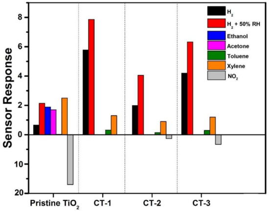 Amperometric sensor measurements of H2, VOCs (ethanol, acetone, toluene, xylene, and chloroform), and NO2 were performed under a constant voltage at different operation temperatures. The gas sensing responses of samples at 200 °C are shown in Figure 8. These data confirm the absence of sensitivity toward acetone and ethanol for Co3O4/TiO2 heterostructures, while TiO2 NTs could sense both VOCs. On the other hand, the sensor response to hydrogen increased with Co3O4/TiO2 heterostructures. The CT-1 sample, compared to the sample of pristine TiO2 NTs, showed an approximately nine-fold higher response to H2. In addition, the response to toluene starts to appear after Co3O4 loading. Sensor responses to 1000 ppm H2 in 50% relative humidity (RT) can be seen in Figure 8. It is well known that the presence of humidity can cause a deterioration in sensor properties [30]. Despite the relative magnitudes of heterostructure sensor responses, compared with those of pristine TiO2, to pure H2 and H2/humidity mixtures, there was no significant improvement observed when humidity was eliminated (Figure 8). In addition to H2 and VOCs, sensors responses to 50 ppm NO2 are given in Figure 7. The sensor responses are 17, 0.02, 1.32, and 3.3 for pristine TiO2, CT-1, CT-2, and CT-3, respectively.