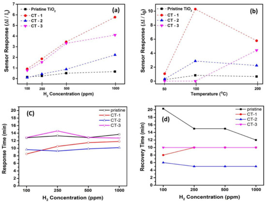 Figure 9a shows sensor responses for different H2 concentrations at 200 °C. Co3O4-loaded samples could detect lower H2 concentrations than pristine TiO2 could. The CT-1 sample exhibited the highest sensor responses at every concentration of H2. Sensor response vs. temperature graph was given in Figure 9b. The CT-1 sample showed better sensor responses at all temperatures. Although the CT-1 sample showed the highest sensor response at 100 °C, a better response time and recovery time for CT-1 were observed at 200 °C (data not shown). Dynamic sensor responses can be seen in Figure 10. It is obvious that, to obtain the best sensor performance from these devices, operation temperature is a critical variable, and its optimum value will be different for each device. Regarding the response time and recovery time, the loaded samples exhibited lower values and thus better performance than did the pristine TiO2 NTs, as can be seen in Figure 9c,d.