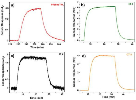 Sensor response versus time graphs of (a) pristine TiO2, (b) CT-1, (c) CT-2, and (d) CT-3 to 1000 ppm H2 at 200 °C.