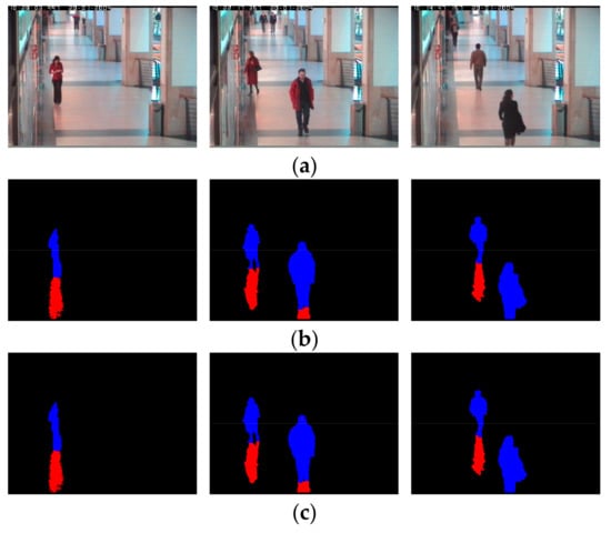 Example of input image, the result of foreground detection, and ground-truth image of non-shadow (human) and shadow areas. (a) Input image; (b) Result of foreground detection; (c) Ground-truth image of non-shadow (blue color) and shadow (red color) areas.