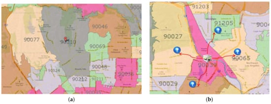 The ZIP code boundary dataset contains spatial data that represent the divided areas within the United States. ZIP codes can be helpful for finding or traveling between two designated locations more efficiently and quickly [3]. Figure 1a shows part of the adjacent ZIP code with 90210 as the center.