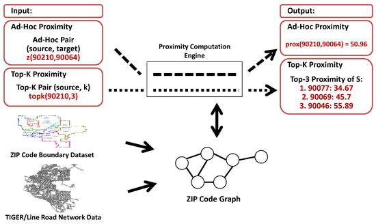 Figure 2 shows a visualization of our problem. A ZIP code graph is built on the basis of a combination of the ZIP code boundary dataset [24] and the TIGER/Line road network data [20]. As shown in the figure, we can process the Ad-Hoc and Top-K proximity using the proposed system.