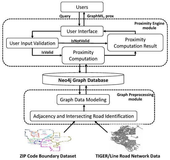Figure 3 shows the proposed system architecture with two main modules and one graph database storage. To be able to compute the ZIP code proximity, we need to transform and combine the ZIP code boundary dataset and the TIGER/Line road network data into an undirected, weighted graph G. This is the function of the graph preprocessing module that uses the graph database storage. Then, the proximity engine module computes the ZIP code proximity by using the graphs.