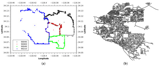 The ZIP code boundary dataset contains the ZIP code boundary points and a centroid (as shown in Figure 4a), while the TIGER/Line road network contains multiline data and the road properties (as shown in Figure 4b). Using the boundary points, we can extract the adjacency connection between ZIP codes. On the basis of the adjacency, we compute the centroid distance and identify the intersecting road. As each road has road type properties, we assign the roads’ different weight values.