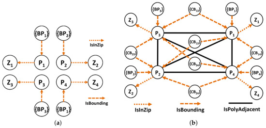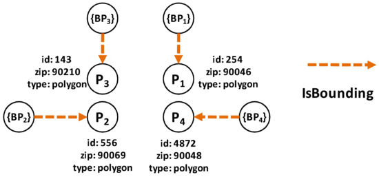 On the basis of Figure 4a, we have four ZIP codes and four polygons with many boundary points for each polygon. Assuming that our ZIP code data are derived from Figure 4a. In the first step, we insert all four ZIP codes in G, Step 1 as shown in Figure 7a. Then, for each ZIP codes, we insert all the polygons and define an appropriate relationship between the ZIP code and the polygon. Step 2.1 in Figure 7b illustrates this process.