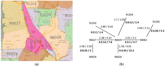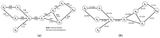 Figure 16b shows the graph of the river-separated ZIP codes set. There are two sets of weights value for each adjacent relationship. The normal type shows the set of the centroid distance and the common boundary length, while the bold type shows the set of the intersecting roads in the form of (primary::secondary::other) and the sum of the assigned road weights.