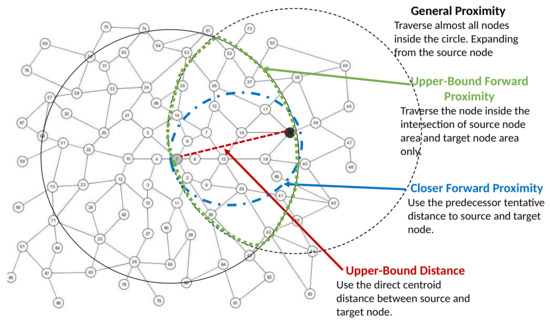 Our naive approach for computing proximity based on the same concept as Dijkstra. It traverses through the neighborhood until it finds the target. The proposed efficient proximity computation is based on a heuristic estimate of distance. It is similar to the A* heuristic choice, past path, and future path, but we increase the degree of relaxation as we also consider the intersecting roads weight in the proximity computation. Table 3 shows comparison between research on the minimum weigh computation.