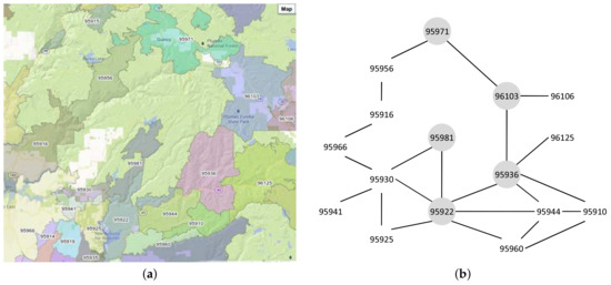 Mountain-separated ZIP code graph. (a) map; (b) ZIP code graph.