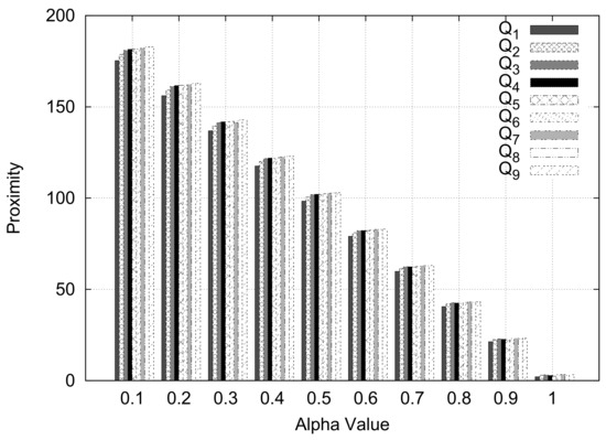 Figure 17 depicts the experimental results. We can see that the proximity values of ten queries are consistently preserved for the varying alpha (weight) values. From the experiment, we can conclude that the proximity results are well preserved although we assign different alpha values. Thus, we will choose 0.5 as a weight value for the centroid distance and the intersecting roads weight between two ZIP codes for the following experiments.