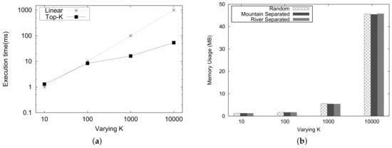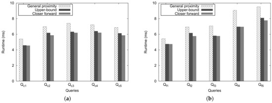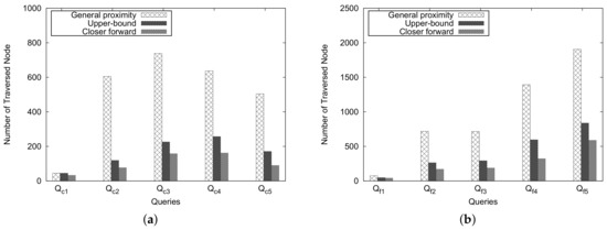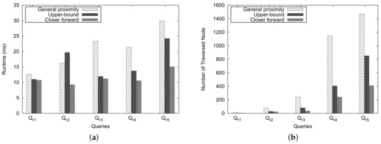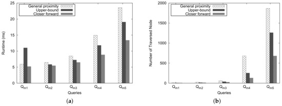 Let us analyze the performance by comparing the results of and . When we see the number of traversed nodes in Figure 20b, the number of traversed nodes for is 20 times more than that for . However, the execution time of as shown in Figure 20a is only four times more than that of in the case of the general approach.