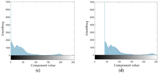 Comparison of R component before and after rotation. (a) The original R component image; (b) the R component image after rotation; (c) the original R component histogram; (d) the R component histogram after rotation.