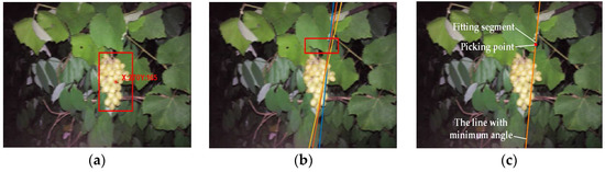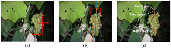 The grape cluster is generally grown vertically to be under the action of gravity [36]. Based on this growth characteristic, the method of grape picking point calculation is proposed as follows: