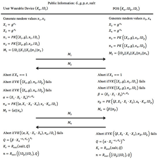 To practically execute this session key construction protocol, both the customer’s smartphone and the POS terminal should have pre-installed the common parameters , where denotes a subgroup of cyclic multiplicative group and g is the generator of G. In order to construct a unique session key, a modified J-PAKE protocol [12,13] is derived and utilized in the session key construction phase. The modified J-PAKE protocol uses a unique and dynamic secret data instead of static password used in original J-PAKE protocol.