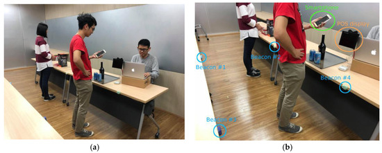 Several methods could be used in indoor positioning algorithms using beacons such as trilateration, triangulation, least squares methods and fingerprinting methods [22,23]. Trilateration and triangulation computation are two common methods that have been widely used in indoor positioning algorithms. In trilateration, the absolute or relative location of a specific target, the customer’s smartphone, is obtained from distance measurements using geometric shapes, i.e., the geometry of circles is used in the case of beacons [24,25]. On the contrary, triangulation methods calculate the targeted point location by forming a triangle from known points (e.g., the beacon’s location) to the target position [26,27]. The difference between triangulation and trilateration methods lies in the distance measurement method, where triangulation only involves angle measurements rather than measuring the distance.