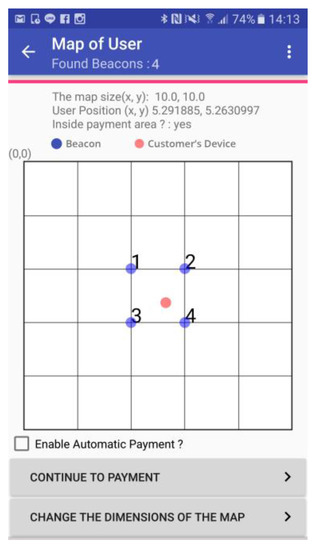 In order to assess the accuracy of indoor positioning function, thirty seven times of position-detection experiments for customer’s smartphone are conducted. In each experiment, the payment App will collect around thirty points of predicted position for the user smartphone based on the selected indoor positioning algorithm. After that, the payment App calculates the average value from these collected points and determines whether the user smartphone is currently located inside the payment area or not.