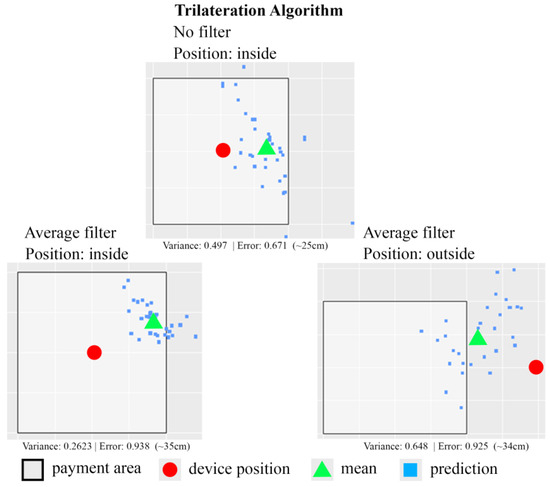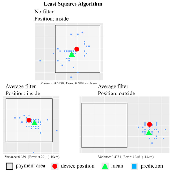The experimental results using a least squares algorithm are shown in Figure 12. The size of the square area shown in Figure 12 is 75 cm by 75 cm. In those experiments, two test strategies are used to detect the position of the customer’s smartphone: one without applying any filter and the other using the average filter. Note that the average filter indicates the averaged position value of all the computed positions of the customer’s smartphone is calculated and returns as the final estimated position. Based on the experiment results, it is clear that the indoor-positioning function implemented with the least squares algorithm plus the average filter performs better than the one without applying any filter. The error of distance measurement between the real device position and the detected device position is around 10 cm to 14 cm. Table 3 shows the experiment data from 148 experiments using least squares algorithm. Based on the experiment data, the least squares algorithm-based positioning function associated with the average filter has 97.29% of accuracy rate. The least squares algorithm-based positioning function without any filter can only achieve 93.24% of accuracy rate.
