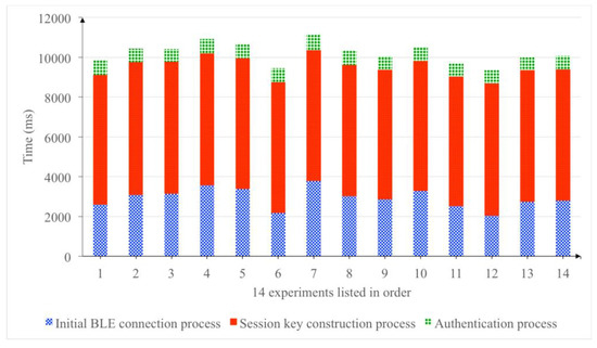 When the prototype is executed to establish a session, almost 64% of the time is consumed during the session key construction phase. Meanwhile, the initial BLE connection process such as the BLE service discovery and pairing process consumes 29% of the total processing time, and the remaining 7% of the time is used for the authentication phase. Figure 14 shows the time consumption of the prototype to establish one payment session in fourteen experiments.