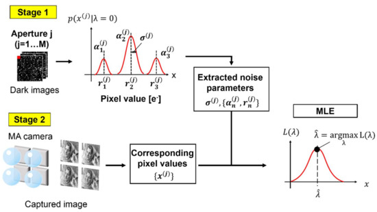 Maximum likelihood estimation (MLE) is a classical statistical estimation method, which estimates λ from the probability density function . In the proposed method, the average number of incident photons, λ, for one pixel in the reproduced image is estimated by MLE from M pixel values that are obtained by the MA camera. MLE is performed in two steps. Step-1: sensor noise for each pixel is modeled as a conditional probability density distribution . Step-2: For every pixel in the reproduced image, the likelihood function is calculated and the optimal λ, denoted by that gives the maximum likelihood is sought. Here, the likelihood function is the product of probability density functions (PDFs), i.e., .