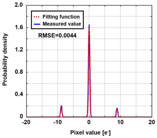 Here, n and k are integer numbers, and λ is a non-negative real number. The standard deviation of the Gaussian distribution is . RTS noise is composed of one or multiple discrete levels. and are the amount and ratio of the n-th RTS noise level in electron, and satisfies for each j. N is the maximum number of the RTS noise levels. The maximum number of electrons considered is K. Note that Equation (8) satisfies the requirements for the PDF, for any λ (0).