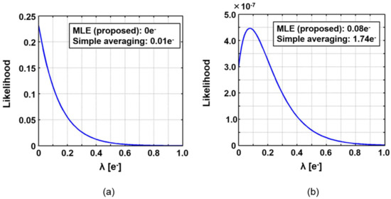 Firstly, the proposed method was applied to dark images where the true value of λ should be 0. Figure 6a is an example of the likelihood function for pixels without RTS noise. In this case, the estimated values by both MLE and simple averaging became very close to the true value. On the other hand, the likelihood function for the pixels with RTS noise is shown in Figure 6b. In the simple averaging, the estimated value significantly deviated from the true value. However, in MLE, the estimated value was little affected by RTS noise.