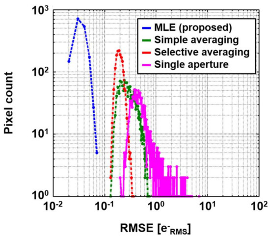 Noise histograms for 5000 dark images are compared in Figure 7, and examples of the processed images are shown in Figure 8. The pixel value is shown by pseudocolor to represent negative values. Those results show that the proposed method is the best noise reduction scheme. In Figure 7, the histogram of a single aperture, which is a reference without any noise reduction, shows the largest peak noise and a long tail caused by RTS noise. Although the peak noise is reduced with the simple averaging, RTS noise still exists. With the selective averaging, RTS noise is effectively removed. However, only 5.94 apertures were selected in the selective averaging because quite a few pixels with the RTS noise were excluded. Therefore, it is expected that photon shot noise is less reduced than in the simple averaging, in which nine apertures are fully utilized. This problem will be discussed later.