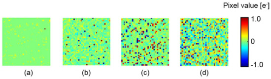 In Figure 6a, the estimated pixel values for MLE and the simple averaging are 0 and 0.01 electrons, respectively, in which the true value is 0 electrons. Thus, MLE gives exactly the same as the true value, namely the error is zero, while it is known that simple averaging gives the same variation as MLE if there is only Gaussian noise. It can be because a non-negative constraint for λ is assumed in Equation (8). The pixel value was not allowed to be negative. Therefore, it could have been forced to converge to zero. To verify this speculation, we added small shot noise, for example, 0.1 electrons in average. In such a situation, the standard deviations of the estimated pixel values for both MLE and the simple averaging became almost the same, which met the knowledge of statistics mentioned above.