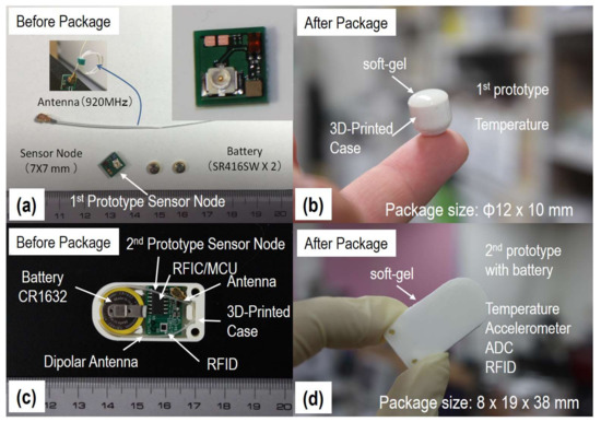 Photos of the first prototype sensor node and second prototype sensor node before (a,c) and after packaging (b,d) using the 3D-printed case, and then covering and filling with bio-compatible soft-gel.